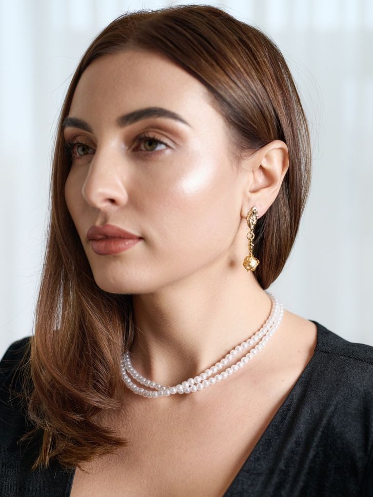 Forma alungită și textura organică a elementelor aurii creează un contrast elegant cu strălucirea delicată a perlei, rezultând o pereche de cercei eleganți cu perle potrivită pentru ținute de seară. Designul lor îndrăzneț îi plasează în categoria cerceilor moderni cu perle, perfecți pentru femeile care iubesc combinația dintre artă, stil și sofisticație.