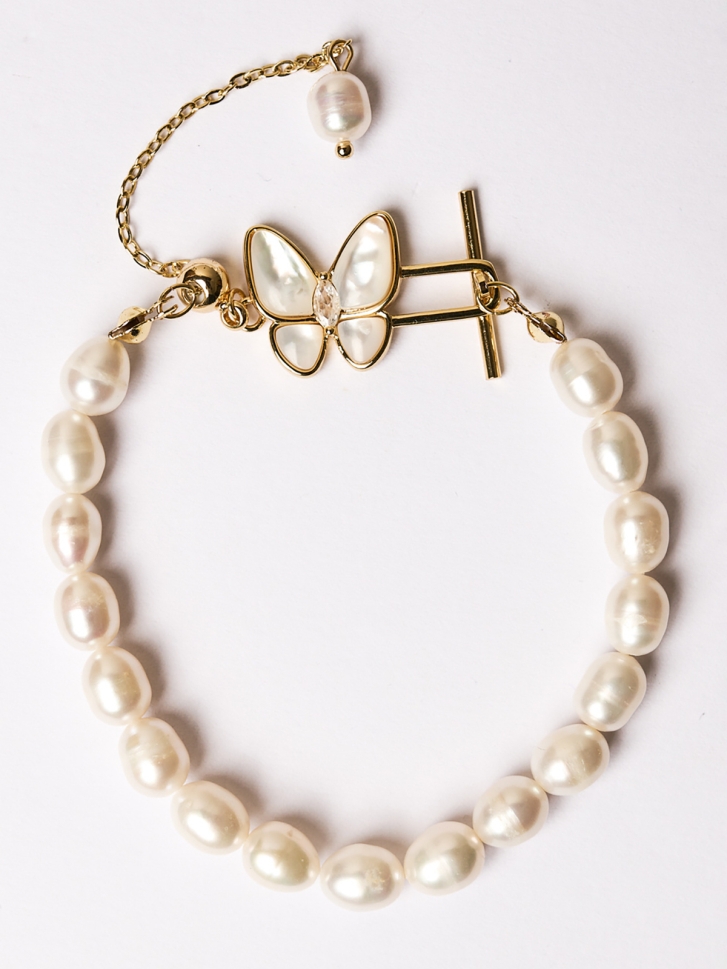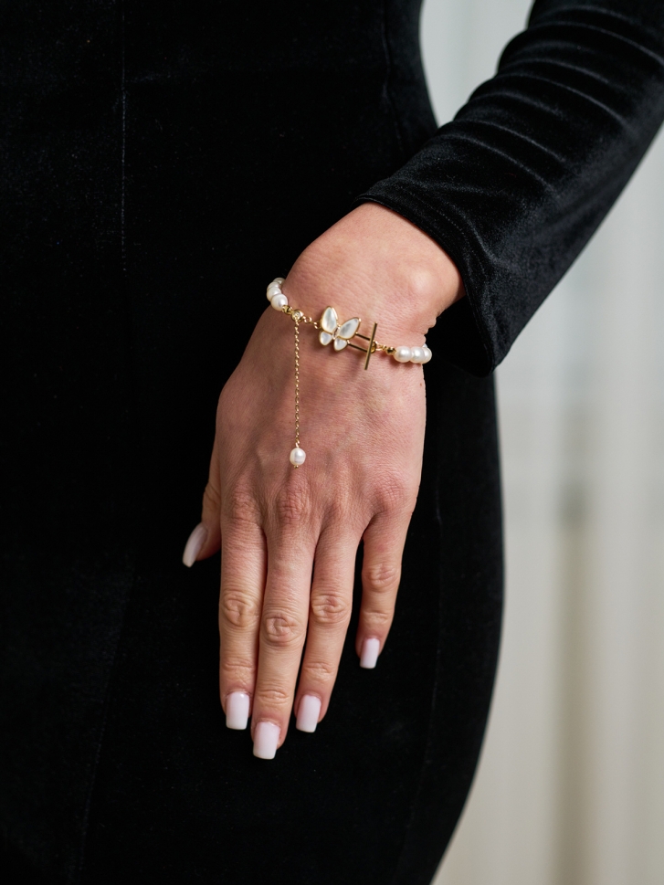 Brățara cu perle Butterfly Set este o bijuterie elegantă creată din perle, completată de un pandantiv delicat în formă de fluture, realizat din sidef și accente aurii. Designul rafinat transformă această brățară cu perle în alegerea ideală pentru femeile care adoră accesoriile premium, cu detalii fine și o strălucire discretă.