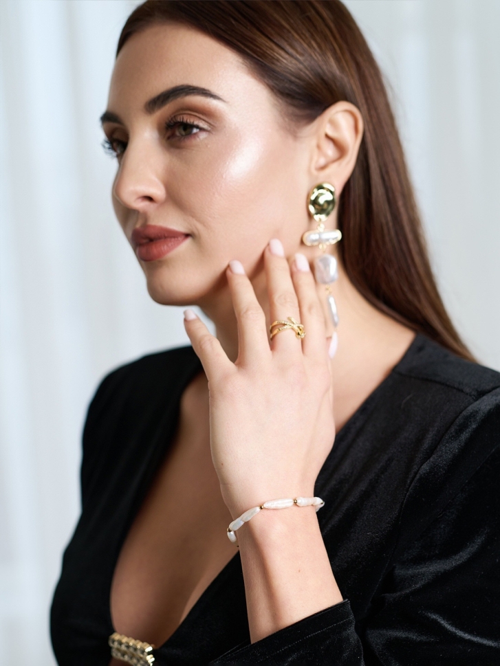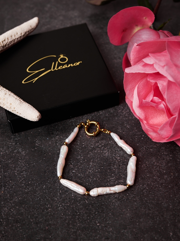 Brățara cu perle Grace este o piesă elegantă creată din perle baroc alungite de apă dulce, selectate pentru forma lor naturală și strălucirea organică specifică bijuteriilor premium cu perle. Fiecare perlă este unică, iar combinația cu biluțele aurii oferă un contrast rafinat, perfect pentru femeile care caută o brățară cu perle autentice, modernă și versatilă.