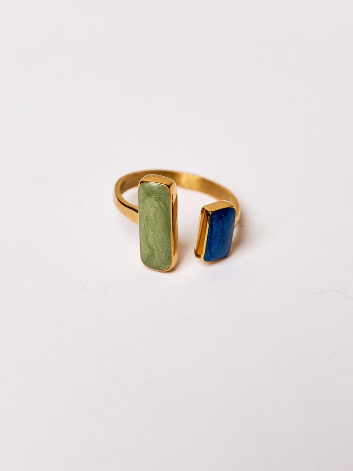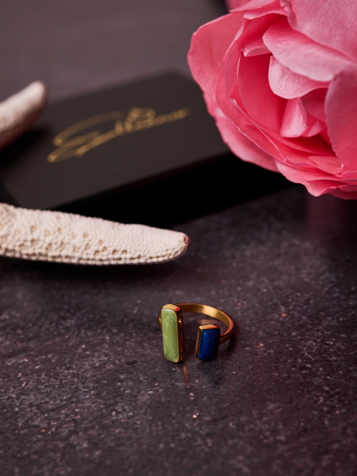Realizat cu atenție la detalii și placat cu aur pentru un plus de lux, acest inel dual cu sidef verde și albastru oferă un echilibru ideal între stil contemporan și accente naturale. Suprafața lucioasă pune în valoare textura delicată a sidefului, transformând inelul într-un accesoriu versatil care completează orice look.