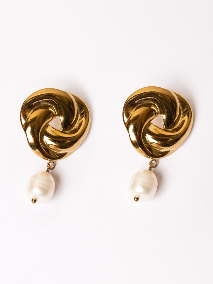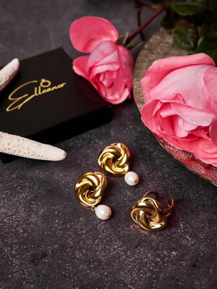 Cerceii placați cu aur 18K sunt completati de perle naturale delicate, care aduc echilibru între forma organică a petalelor și finețea perlelor, creând un efect elegant și feminin. Inelul asortat, placat cu aur 18K, urmează același design floral sculptat, oferind coerență întregului set și evidențiind frumusețea mâinilor prin strălucirea sa subtilă.