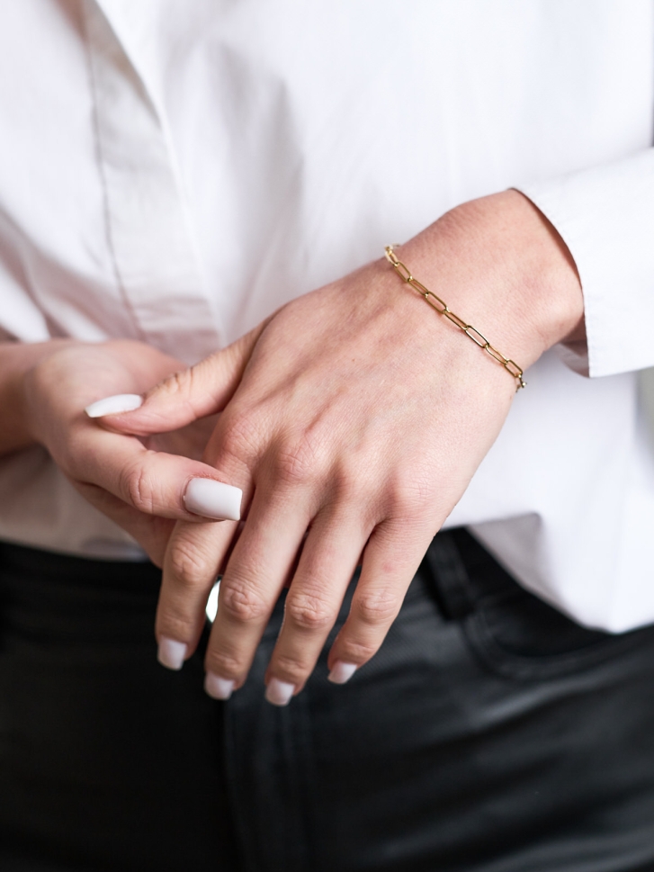 Datorită designului aerisit și finisajului impecabil, această brățară cu zale placată cu aur 18K captează frumos lumina și adaugă o notă discretă de lux oricărui outfit. Este ușoară, confortabilă și prevăzută cu un sistem de închidere sigur, făcând-o perfectă pentru purtare zilnică sau layering cu alte brățări fine.